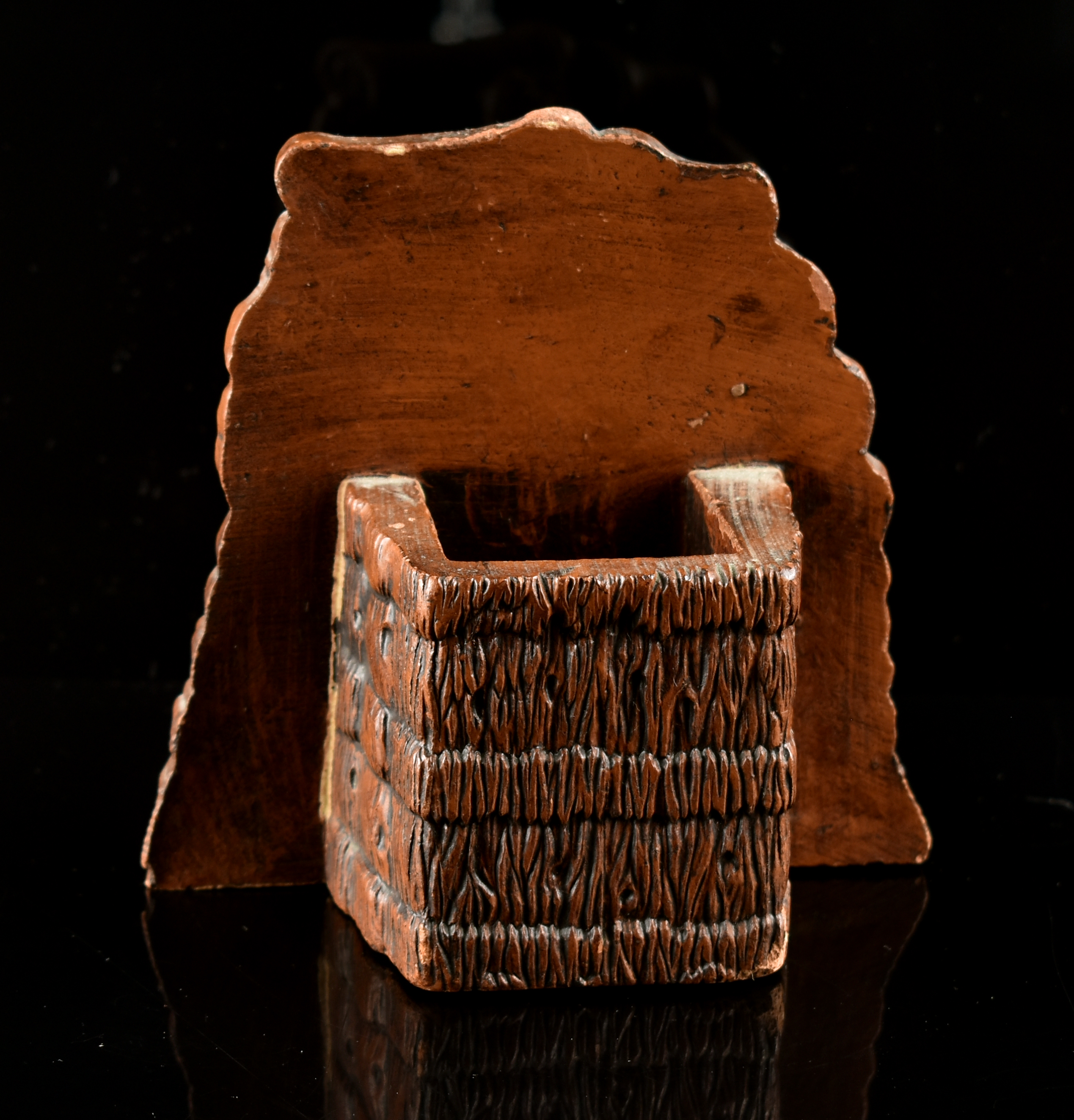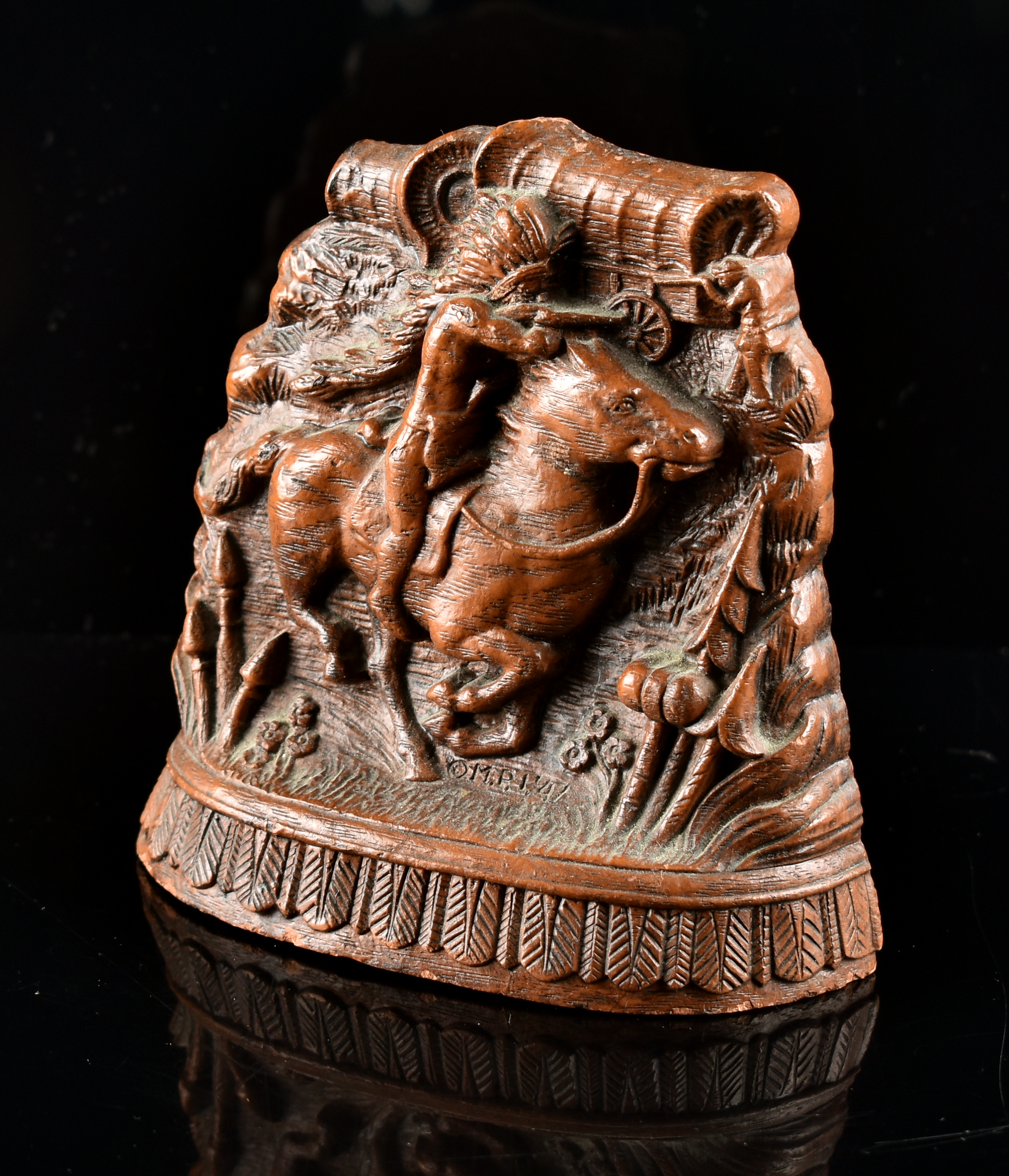 Features a Chieftain on Horseback attacking a conestoga wagon/pioneer. Lots of imagery in the periphery. Signe ‘M.P.I. ’47” so it dates this piece to 1947. Resin.