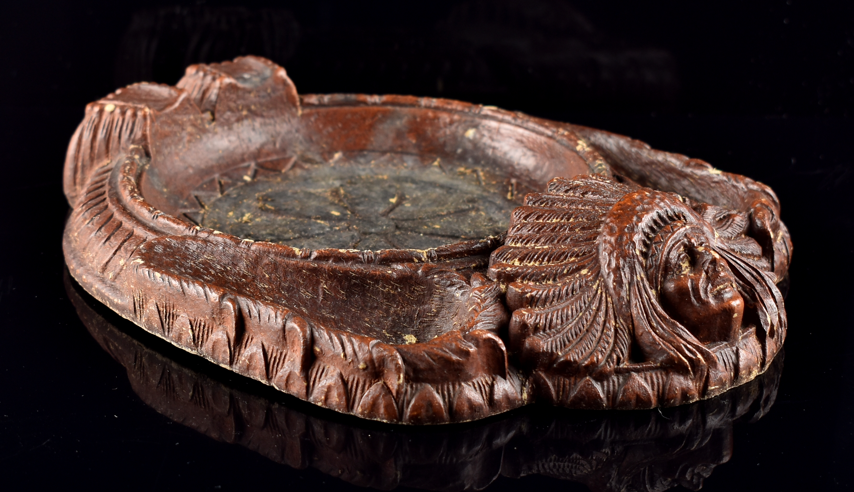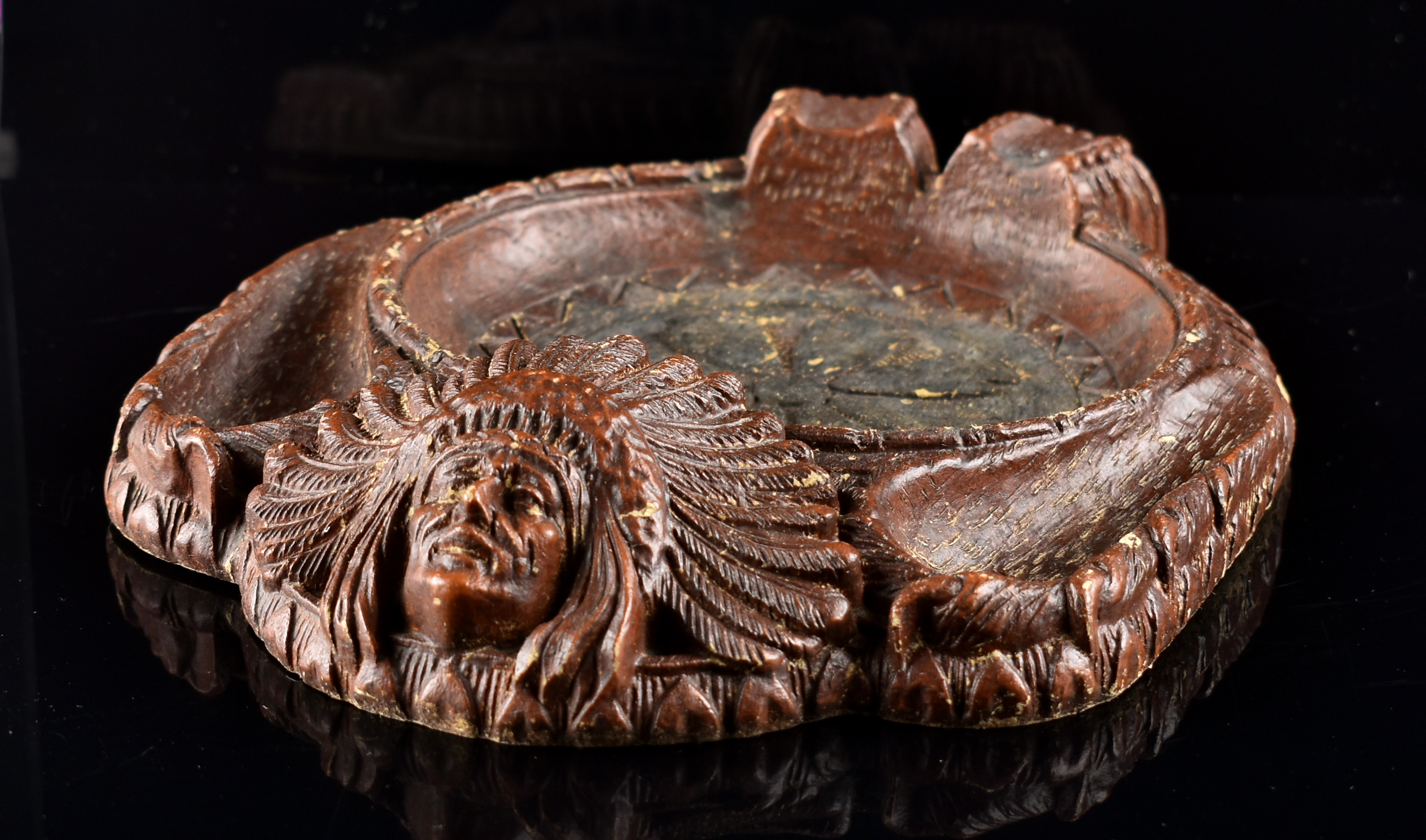 Exceptional LARGE Ashtray featuring Eagle Claws, A Chief with headdress, and Arrowheads in the Ashtray bottom. Two pipe holder-trays and two cigar rests. Late 1940’s 1950’s example. Resin. 7″ by 9″