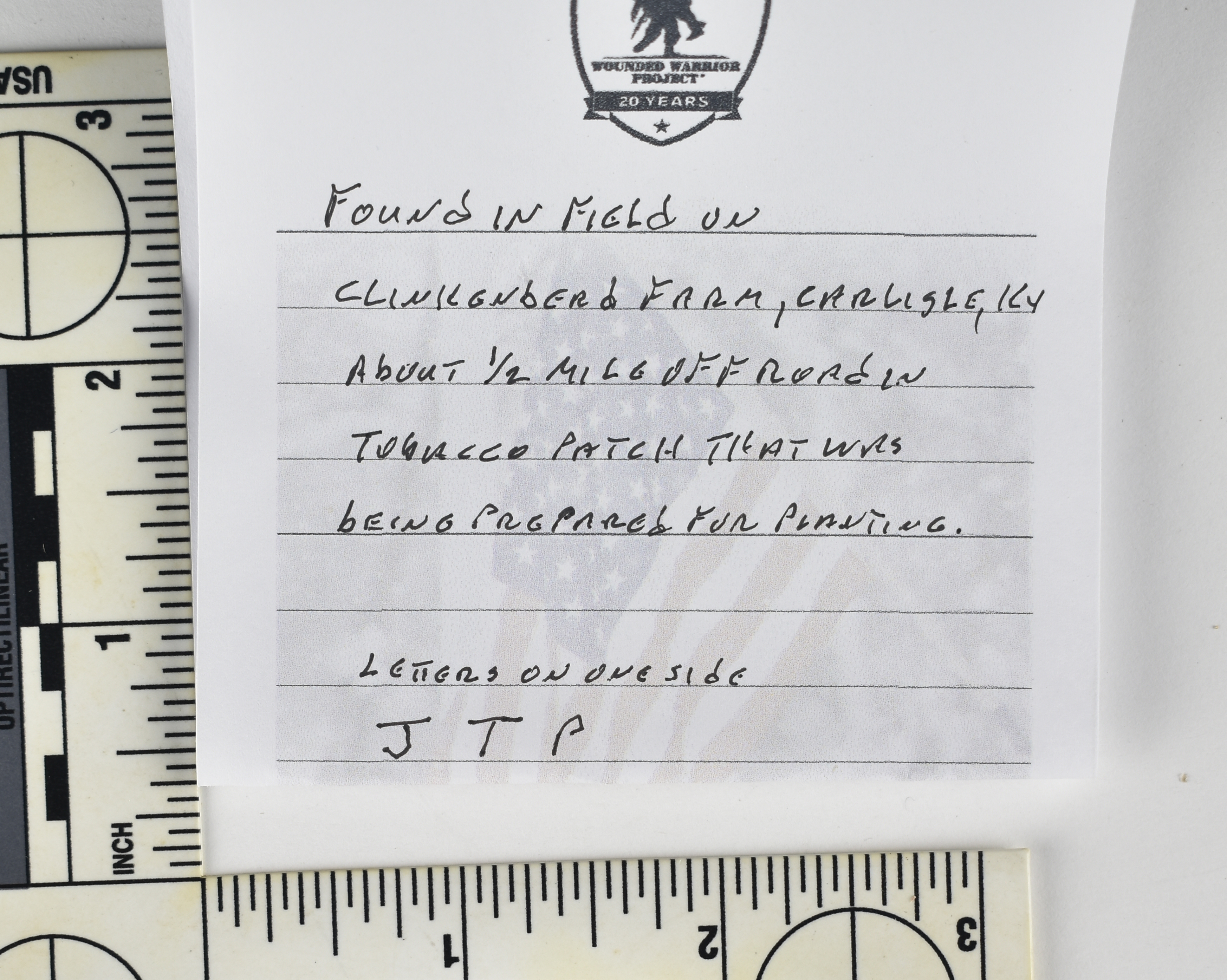 Found in field on Clinkenberd Farm, Carlisle Kentucky about 1/2 mile off the road. Engraved ‘JTP’ on one side, and reverse appears to have additional engraving with potentially a date. Interesting. Ex Robertson Collection