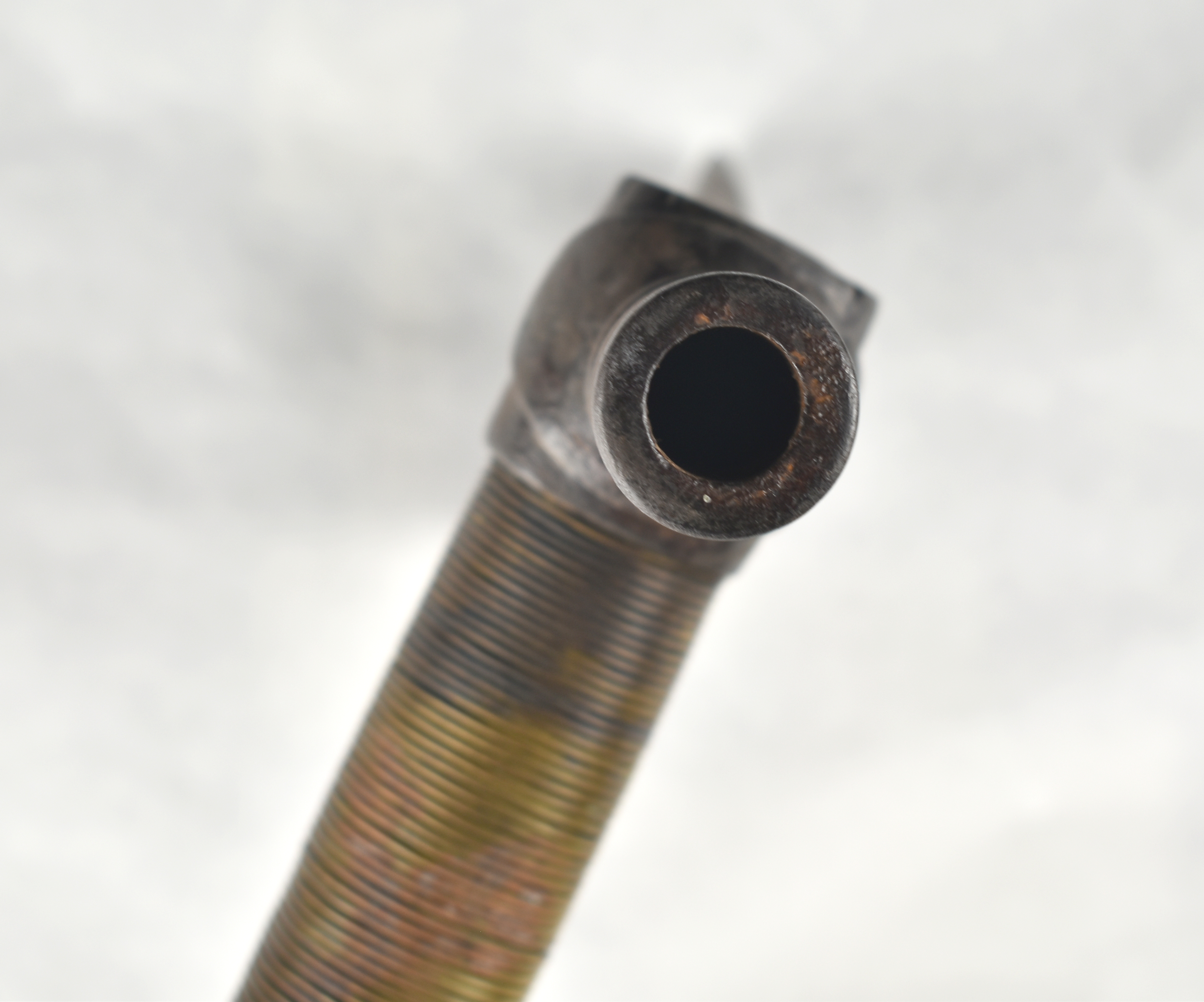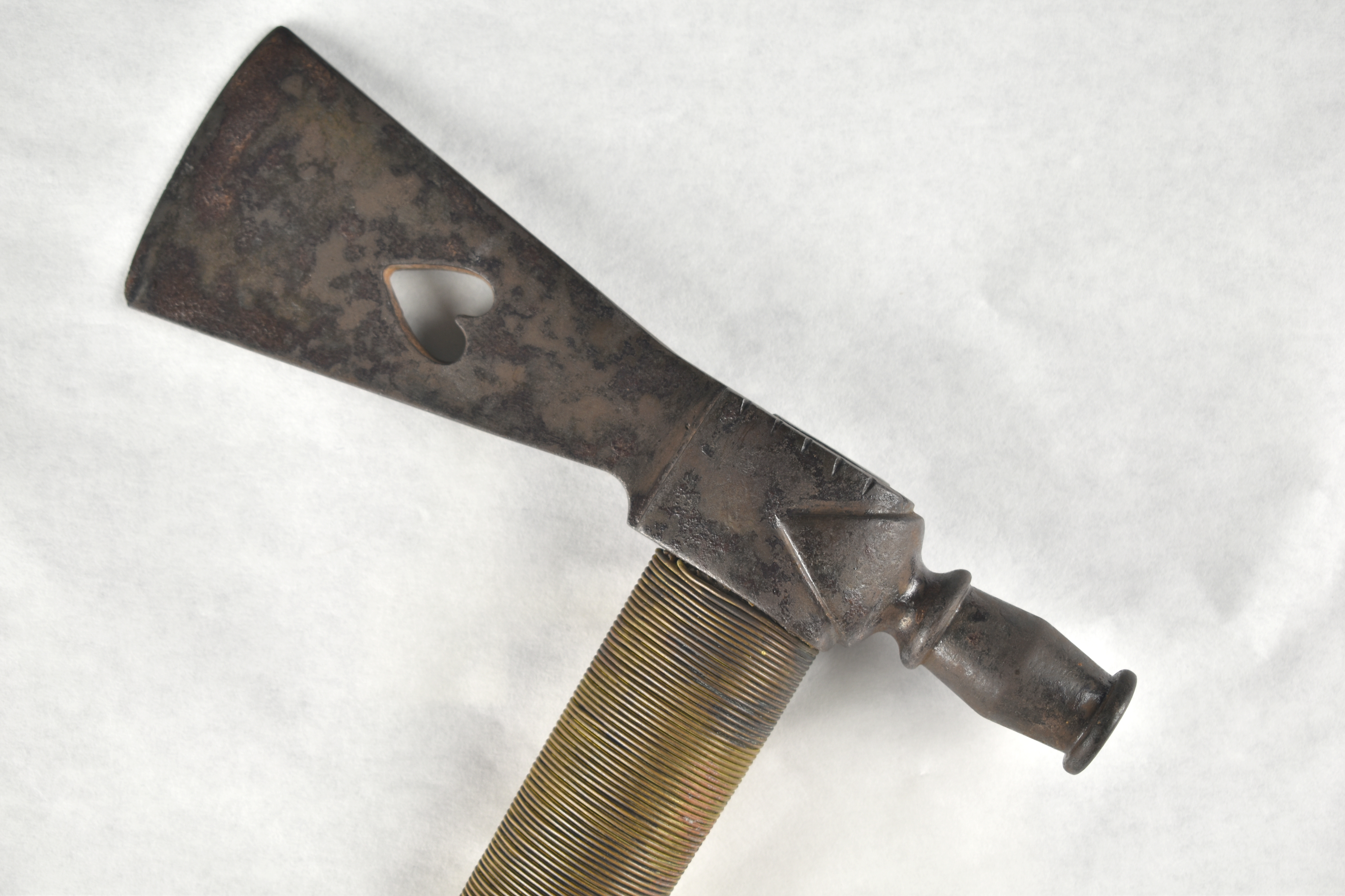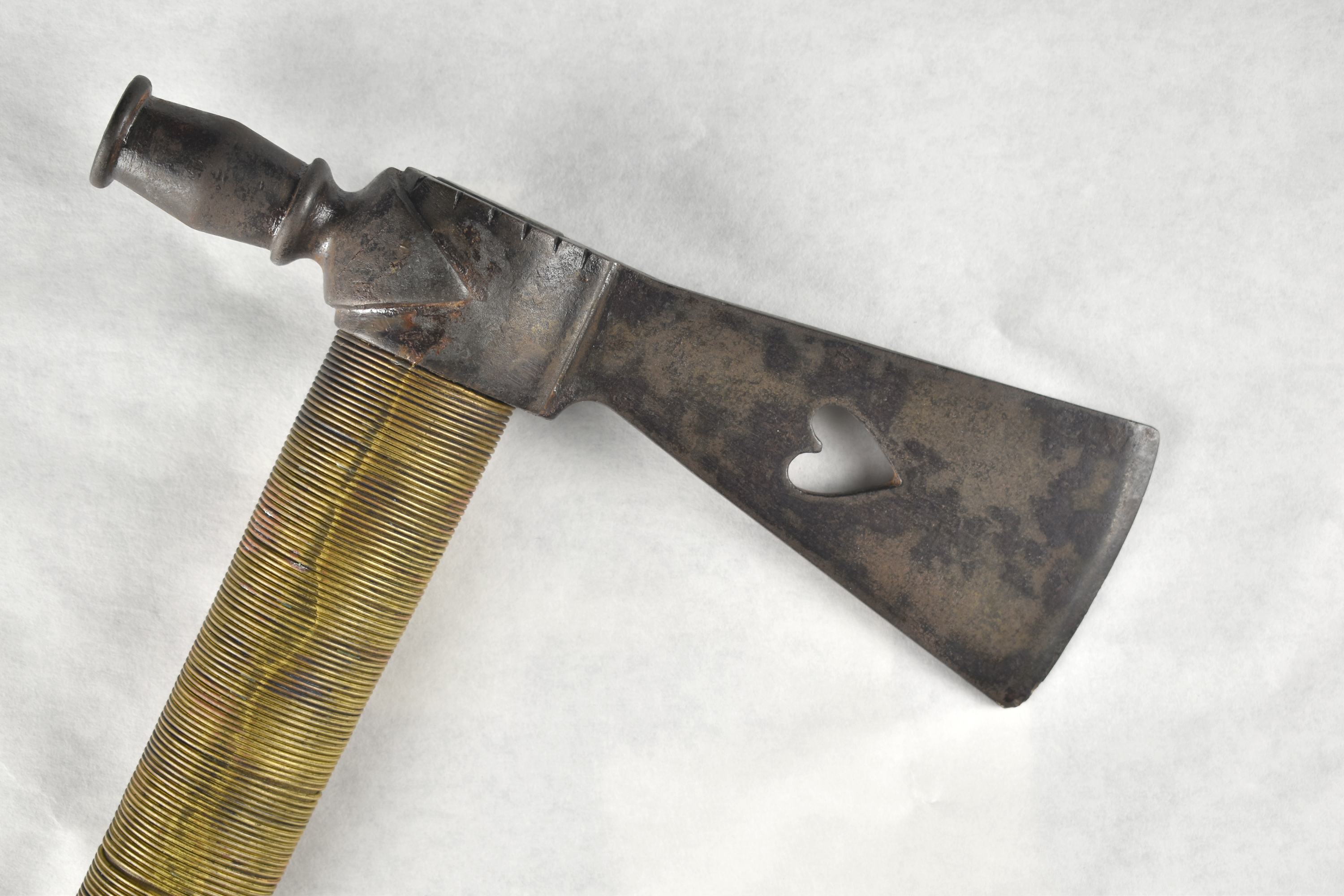 18.5″ Pipe Tomahawk of unknown age. Selling as Decorative and as-is. Appears to have a Pewter plug at one end, features a heart cutout, and does draw. Would make an excellent decorative display example.