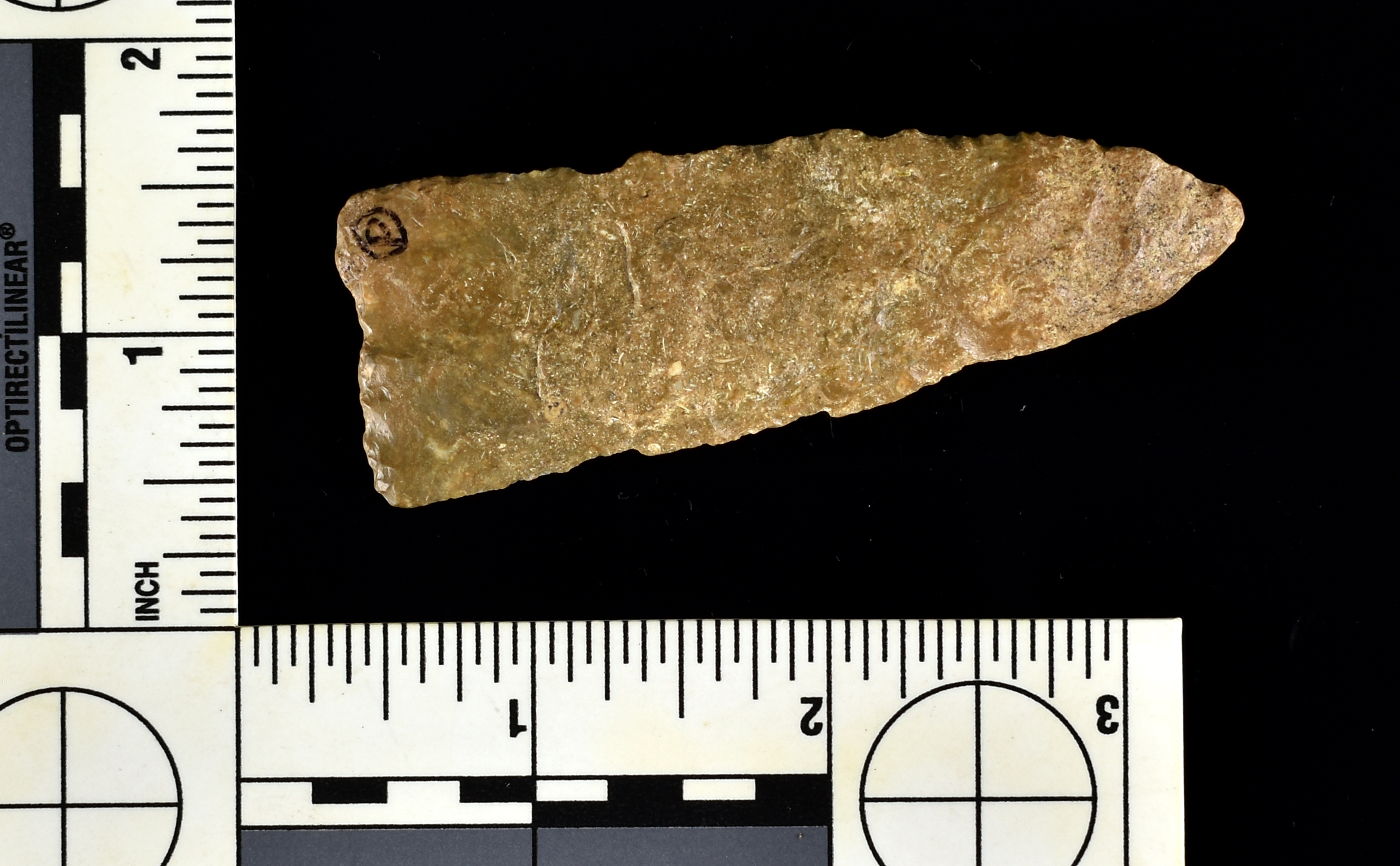 Classic river polished example formerly of the Lyle Nickel collection and found along the Arkansas River below the Kaw Dam. Kay Co., Oklahoma. Perino (1999), Stermer (2007), Earthworks (2006) Coa’s. Florence Chert. Well flaked and has that glossy river polish!