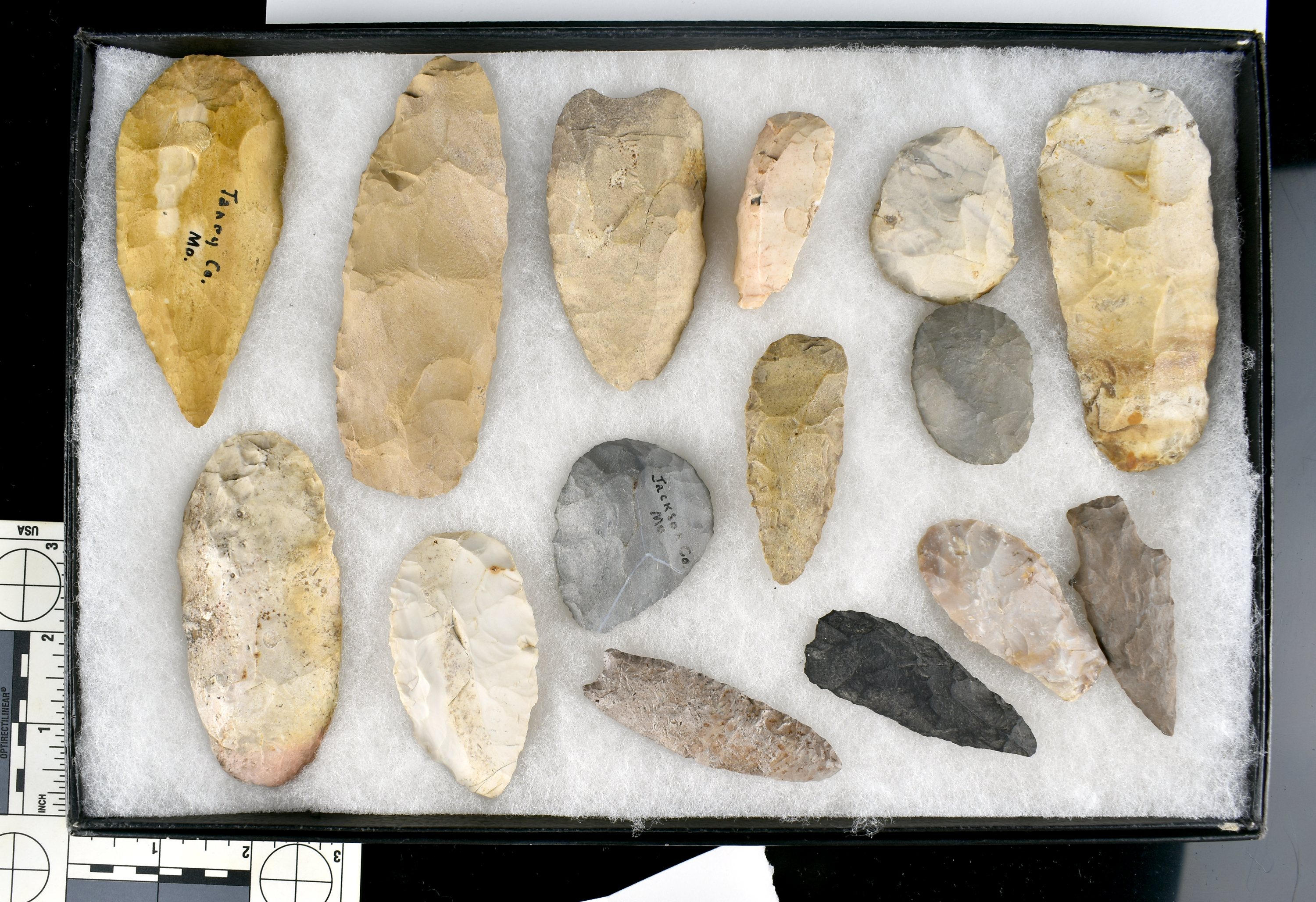 8x12 display of 15 Knives/Scrapers/Flint Celts
