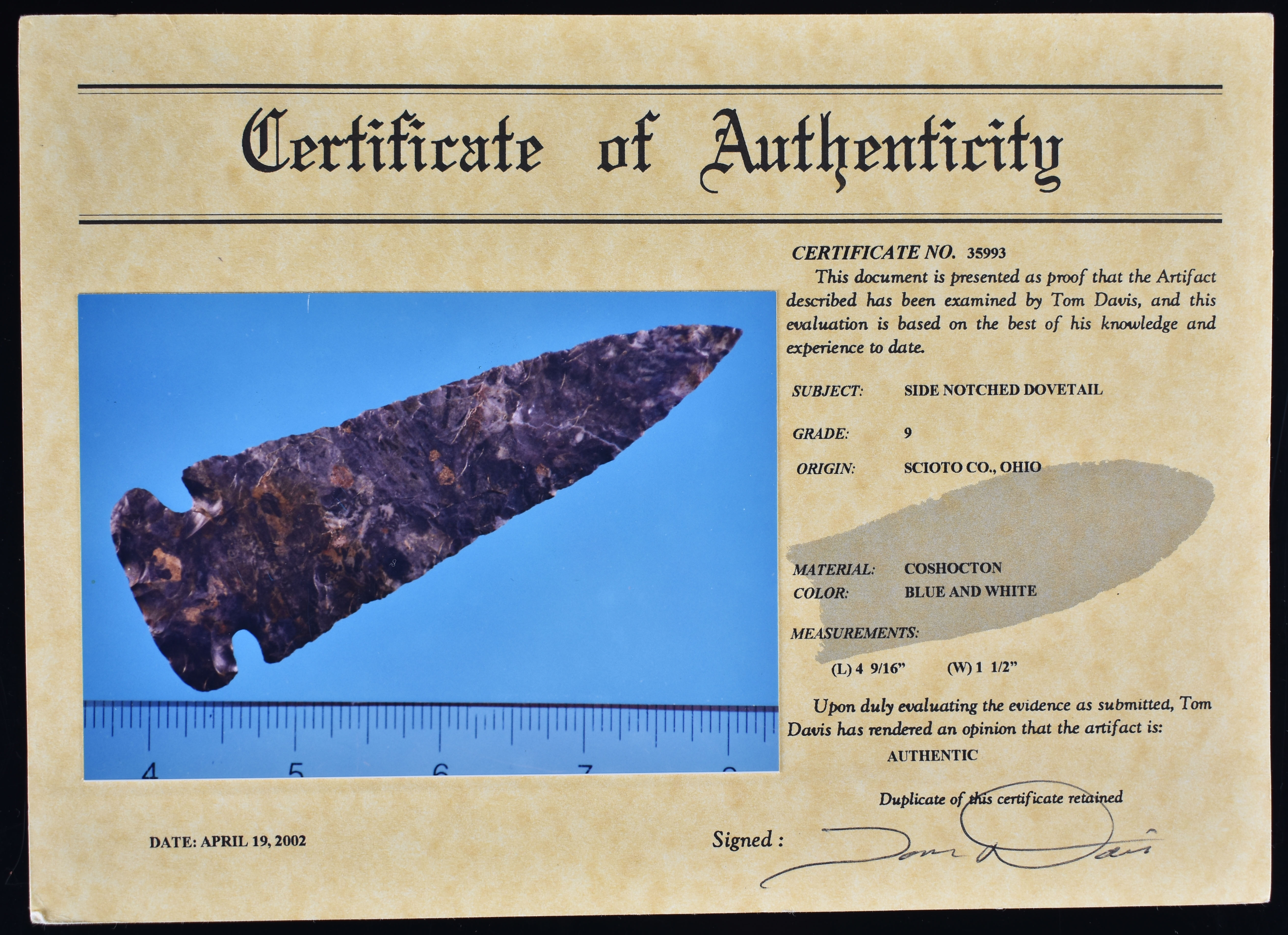 Very nice example from Scioto Co., Ohio in Coshocton Flint. Tom Davis COA as ‘Side Notched Dovetail’ in 2002. Ex Steve Walker, Langford Keith Collection.