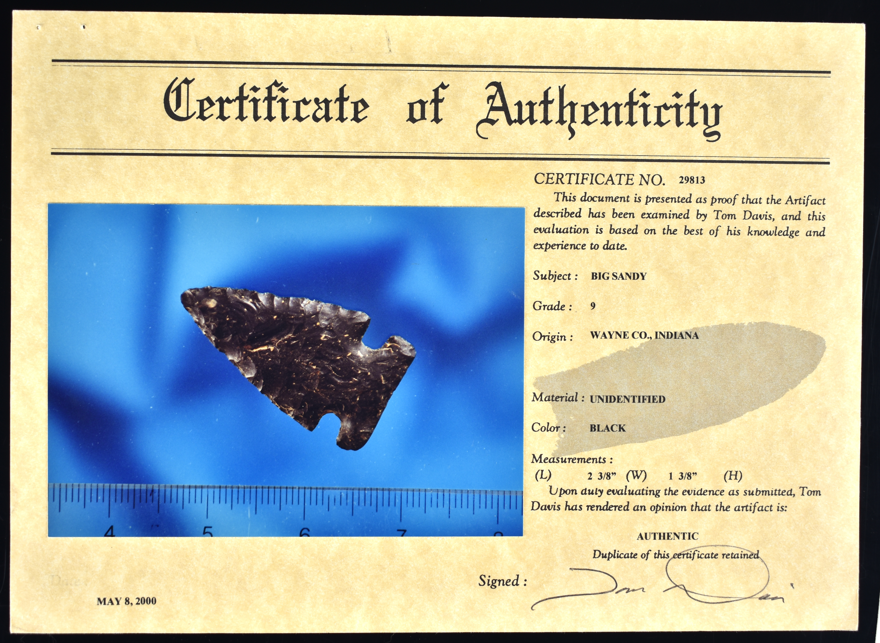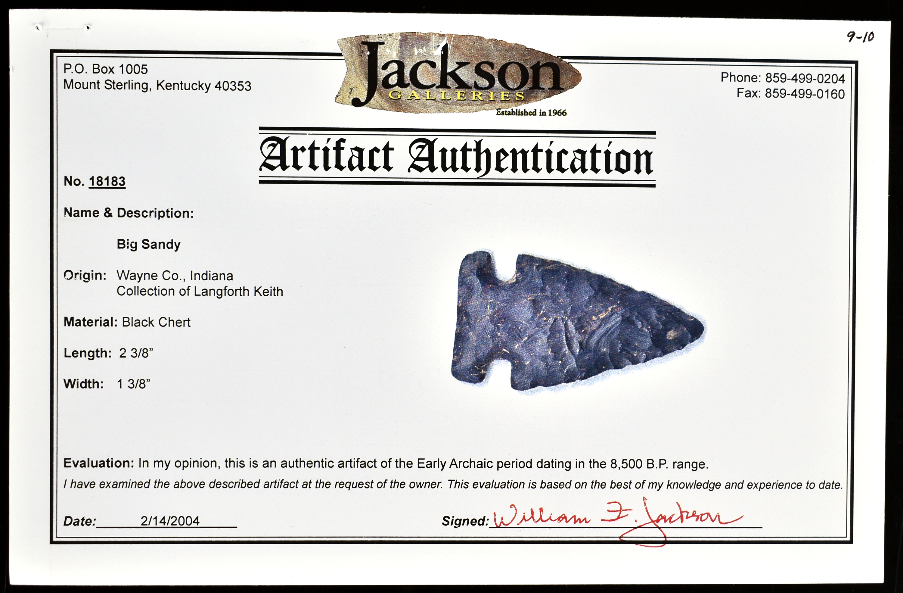 Pretty example from Wayne Co., Indiana in a black fossil chert Ex- Langford Keith Collection. Jackson (2004) and Davis G-9 (2000) COA’s.