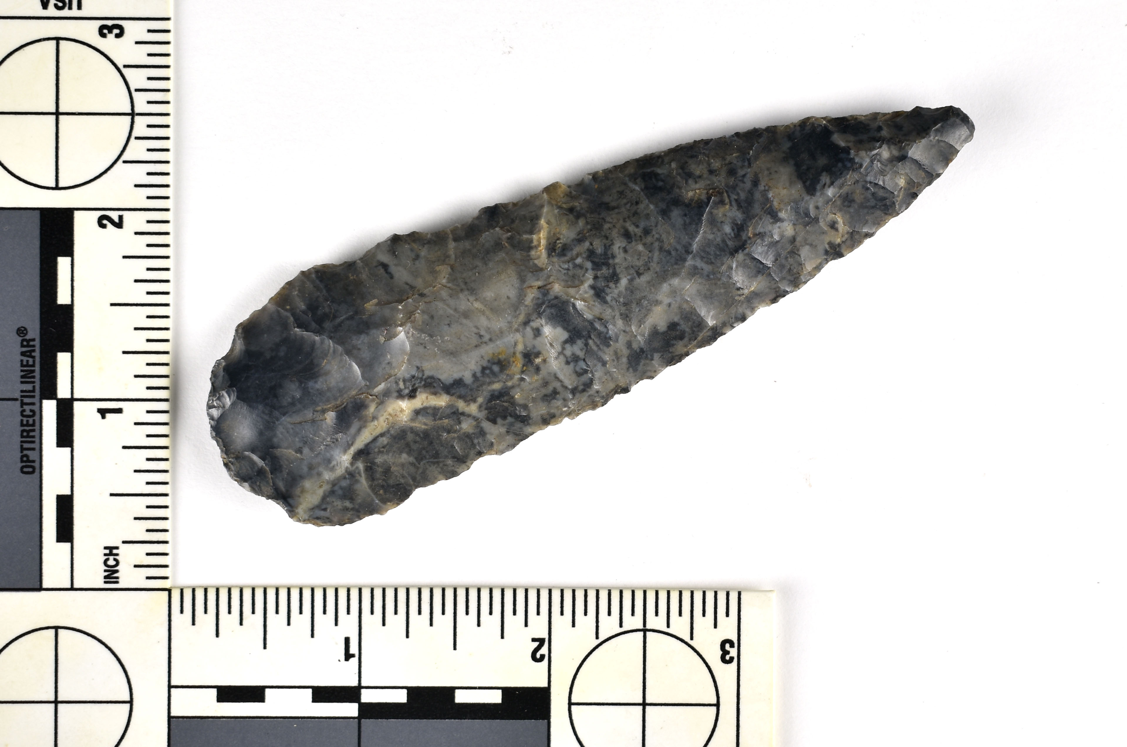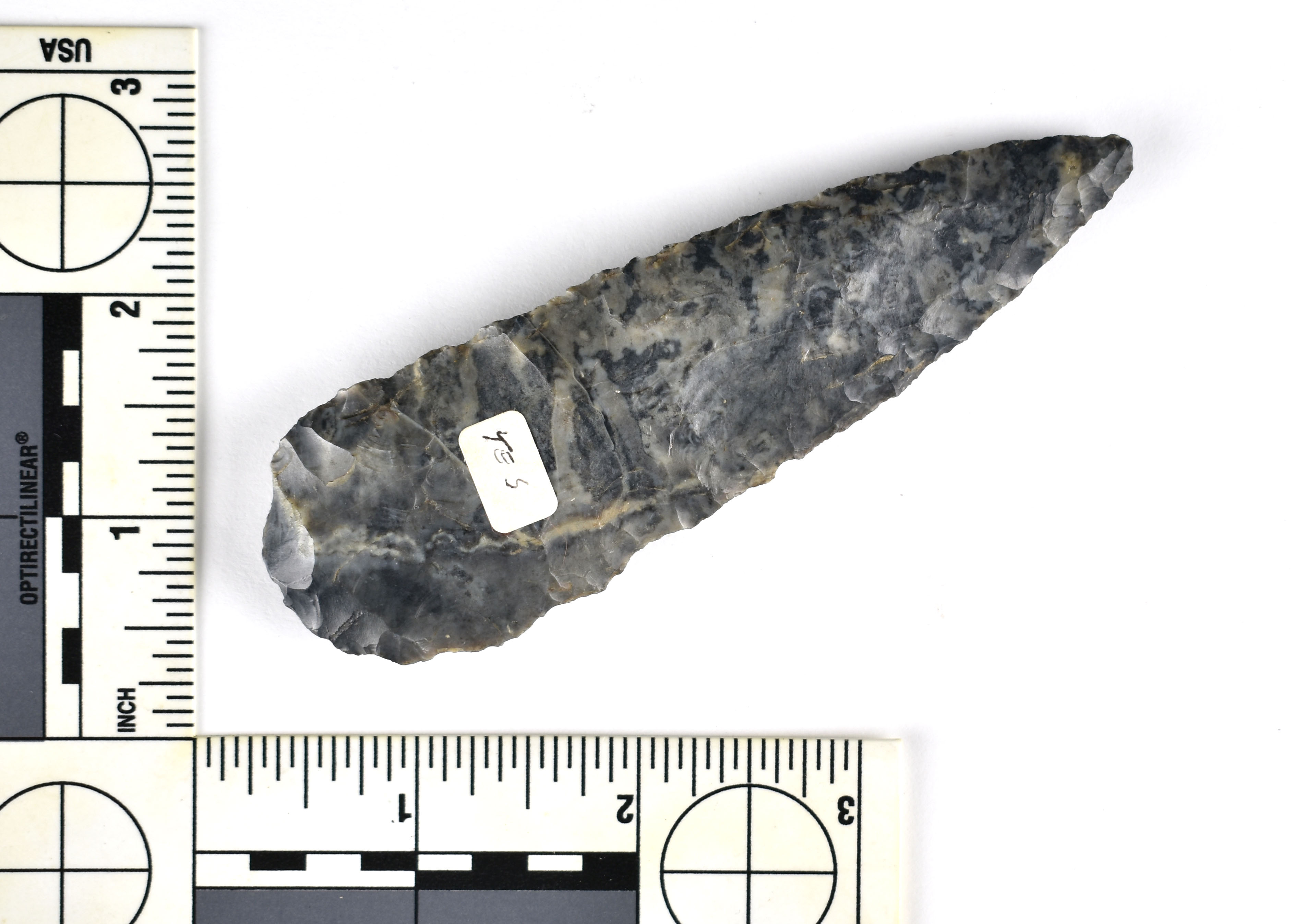 Ohio example in Coshocton flint formerly of the Langford Keith Collection. Proper primary flaking with secondary bifacial resharpening pattern.
