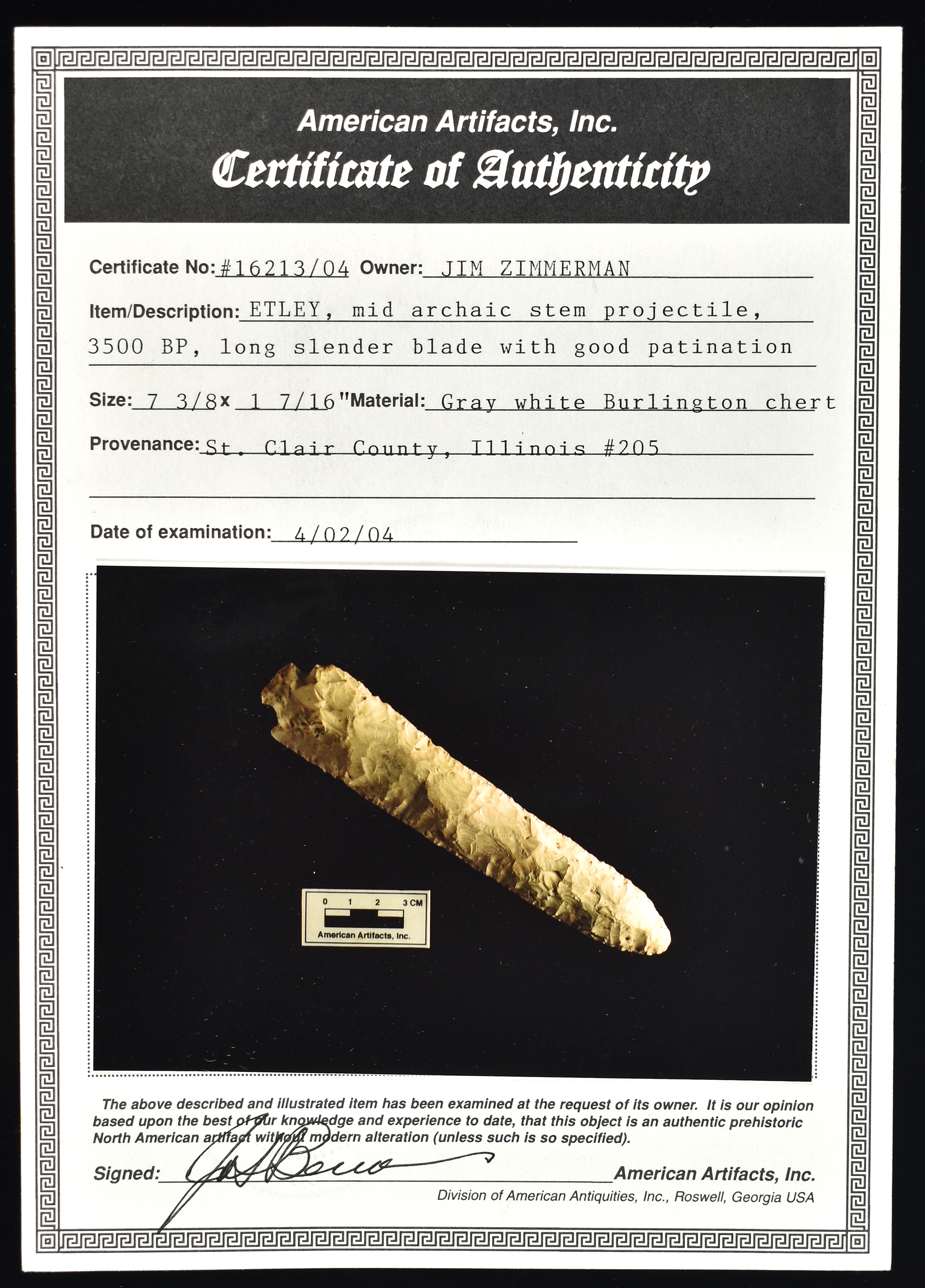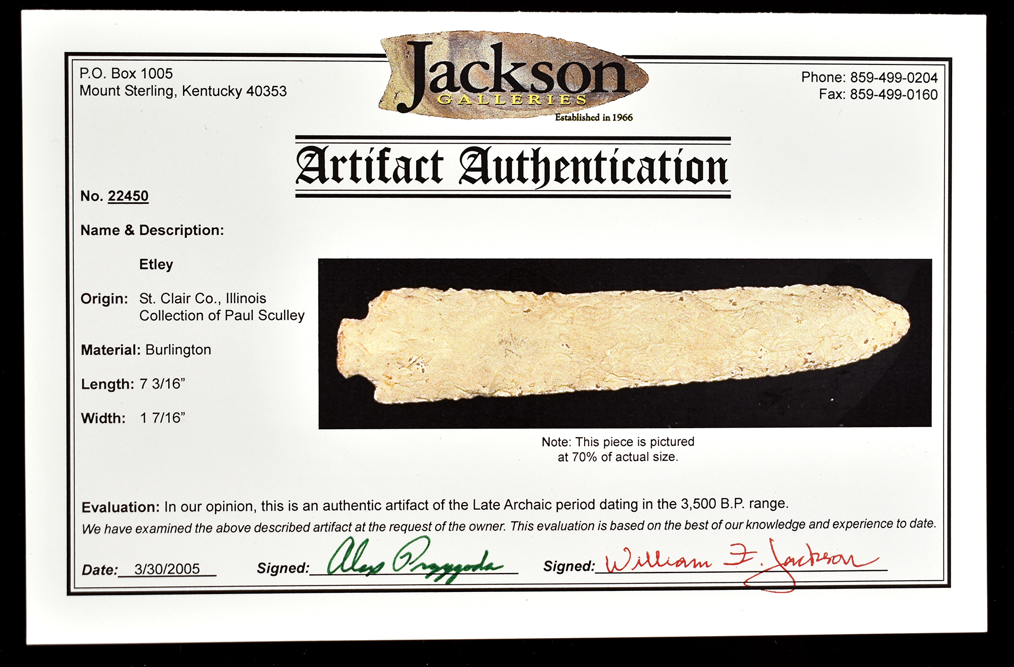 Large example from St. Clair Co., Illinois. Formerly of the Jim Zimmerman, Paul Sculley and Ricardo Wyatt Collections. Burlington Chert. Jackson COA. Berner COA.