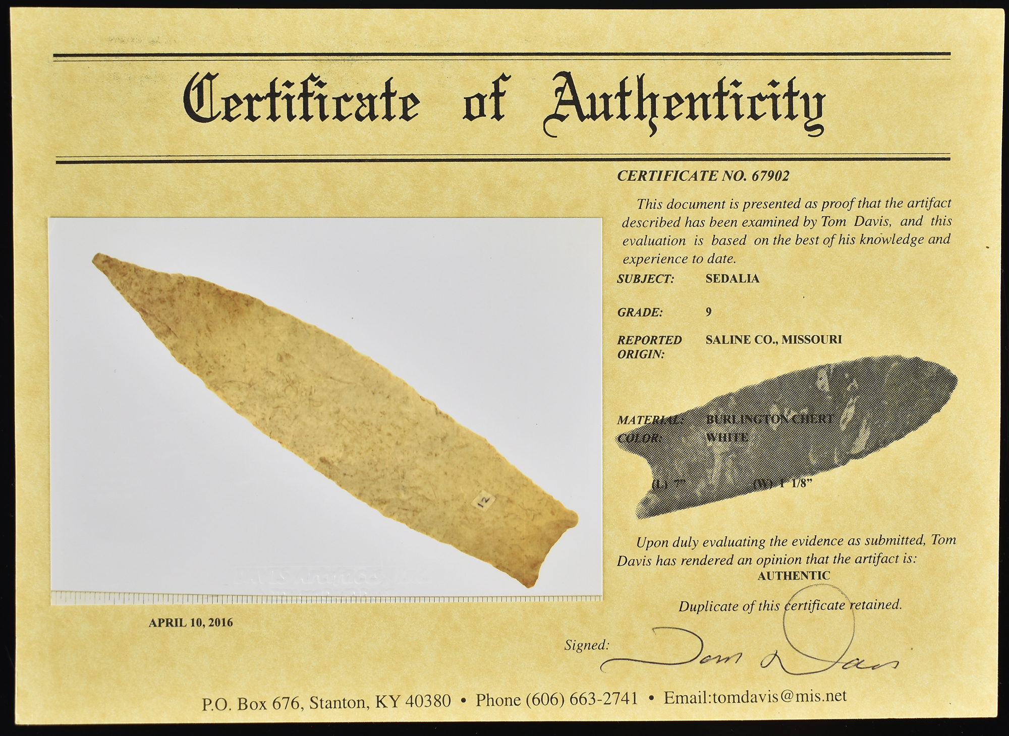 Substantial Sedalia Point from Saline County, Missouri, formerly of the Maury Meadows Collection. This Burlington chert example has a G-9 paper from Tom Davis dated 2016.