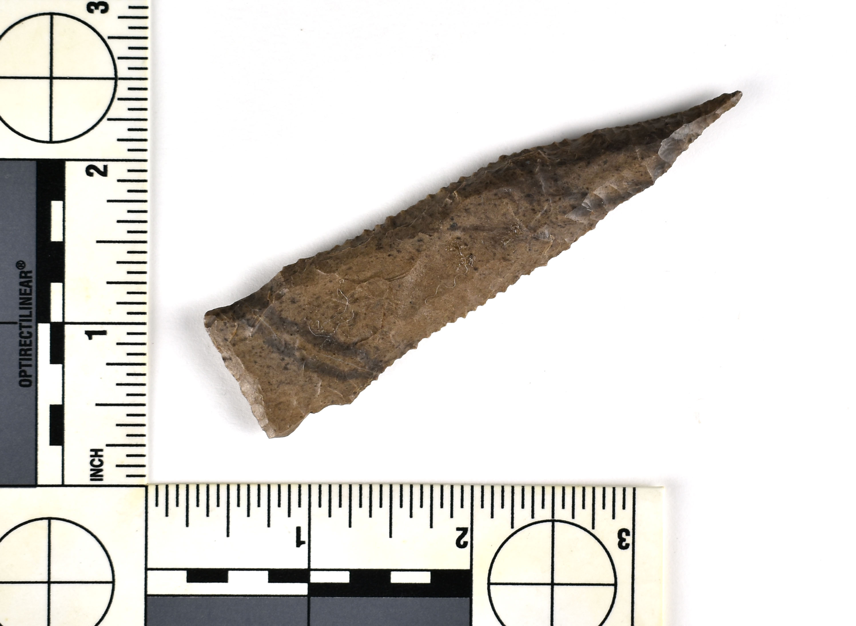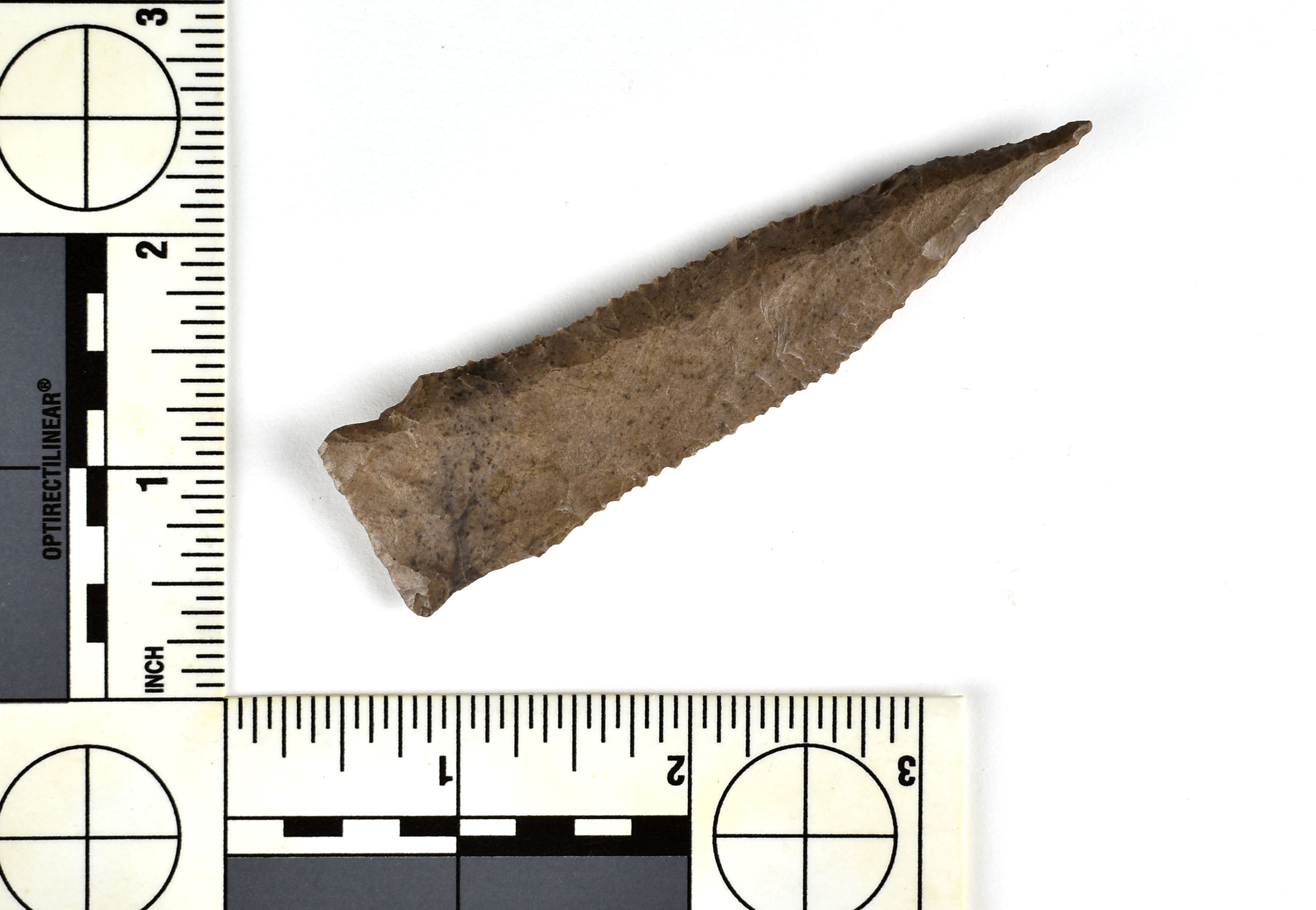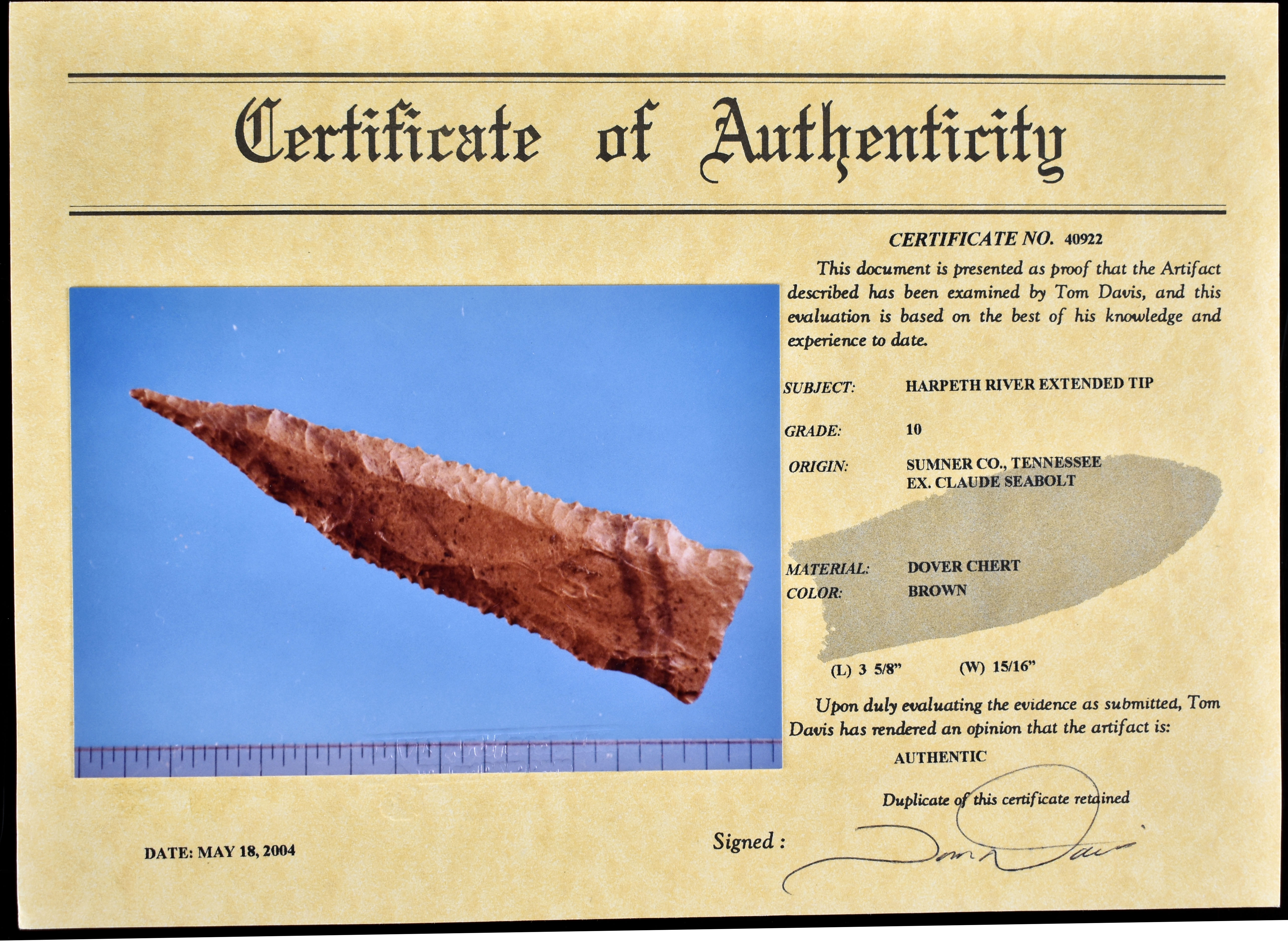 Fantastic example in Dover chert, this Extended Tip Harpeth River  is from Sumner Co., Tennessee. Ex Claude Seabolt, Steve Walker, and Langford Keith Collections. Tom Davis G-10 COA from 2004.