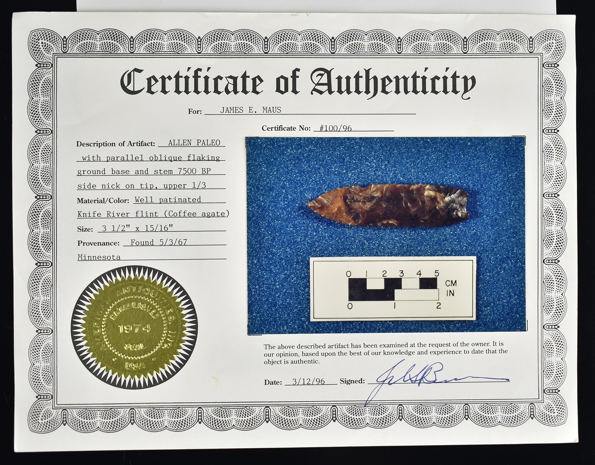 Nice Minnesota example found in May of 1967. Berner notes it as Knife River Flint. Formerly of the James Maus, Tom Davis, Ricardo Wyatt Collections. Berner COA (1996)