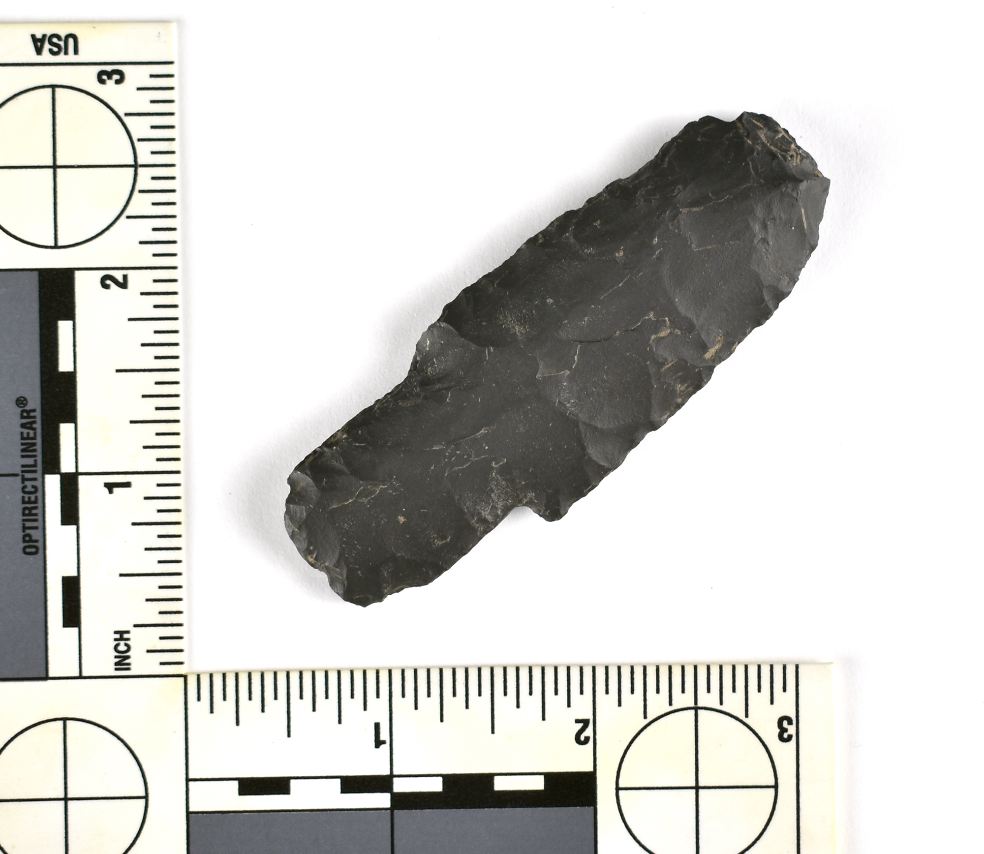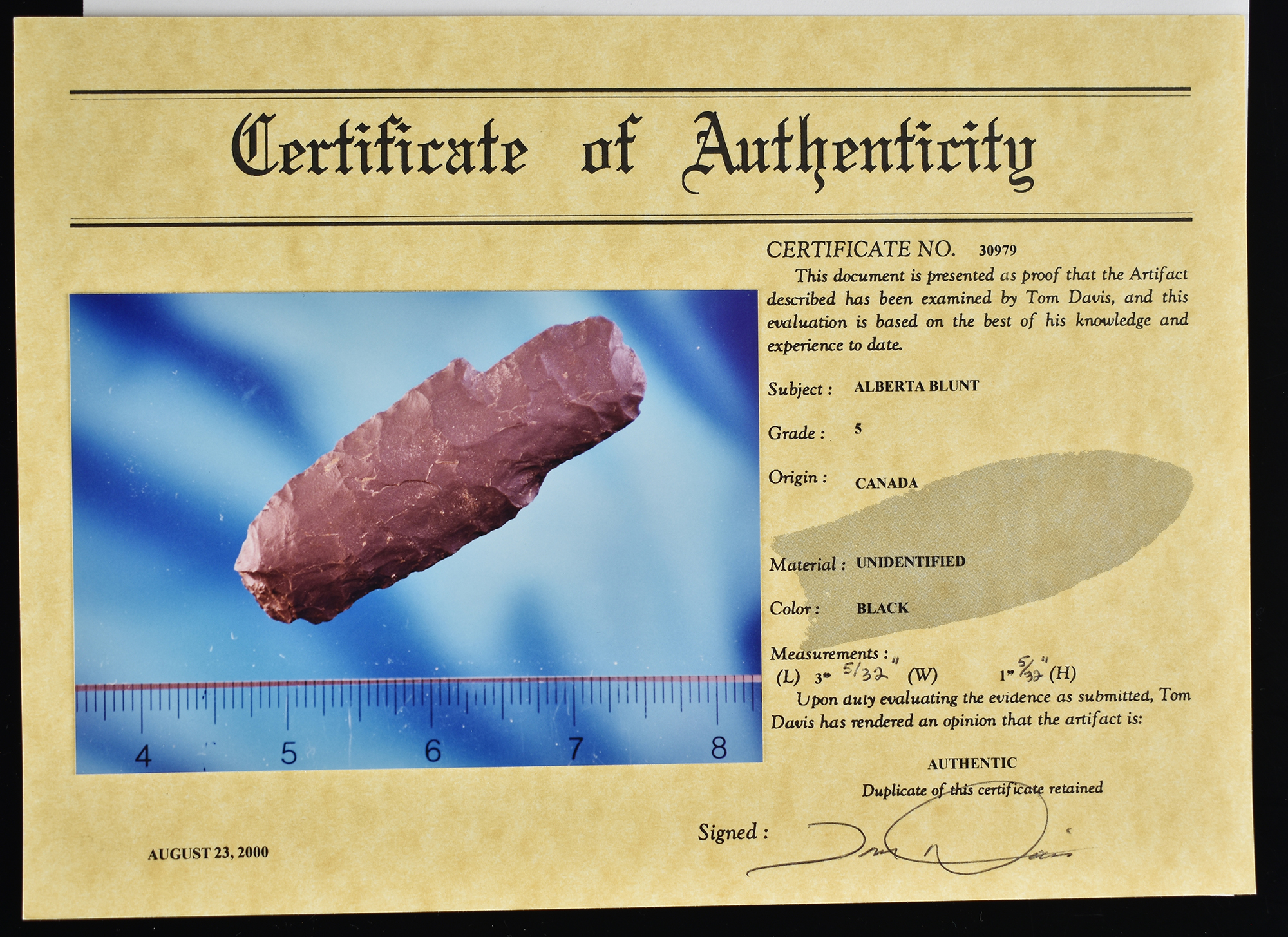 Classic example in black chert or dacite reported from Canada. (Most likely Canada’s central plains provinces). Ex Wyatt Collection.