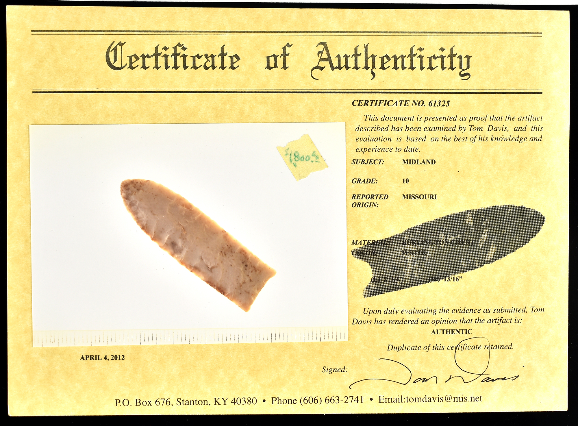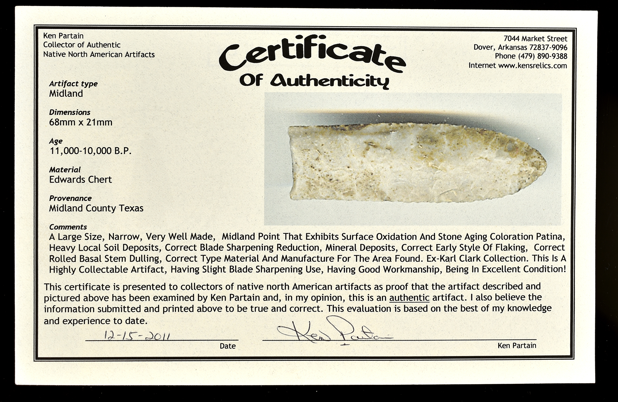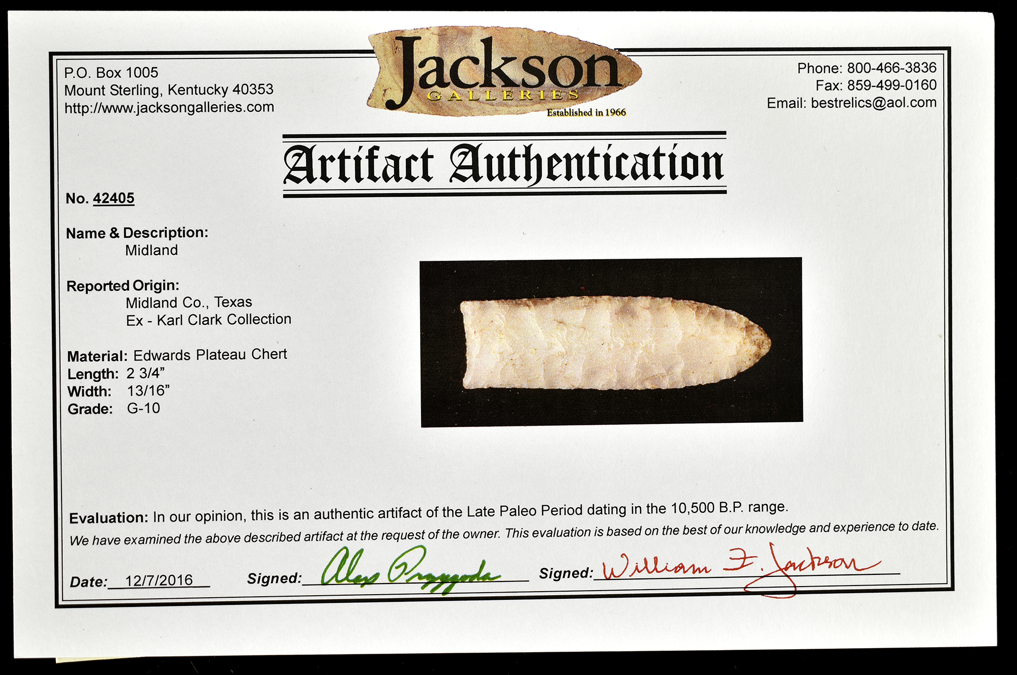 Stunning textbook example from the Karl Clark and Ricardo Wyatt Collections. Whitish Edwards Plateau Chert from Midland Co., Texas. Tom Davis G-10, Jackson G-10, and Partain COA’s.