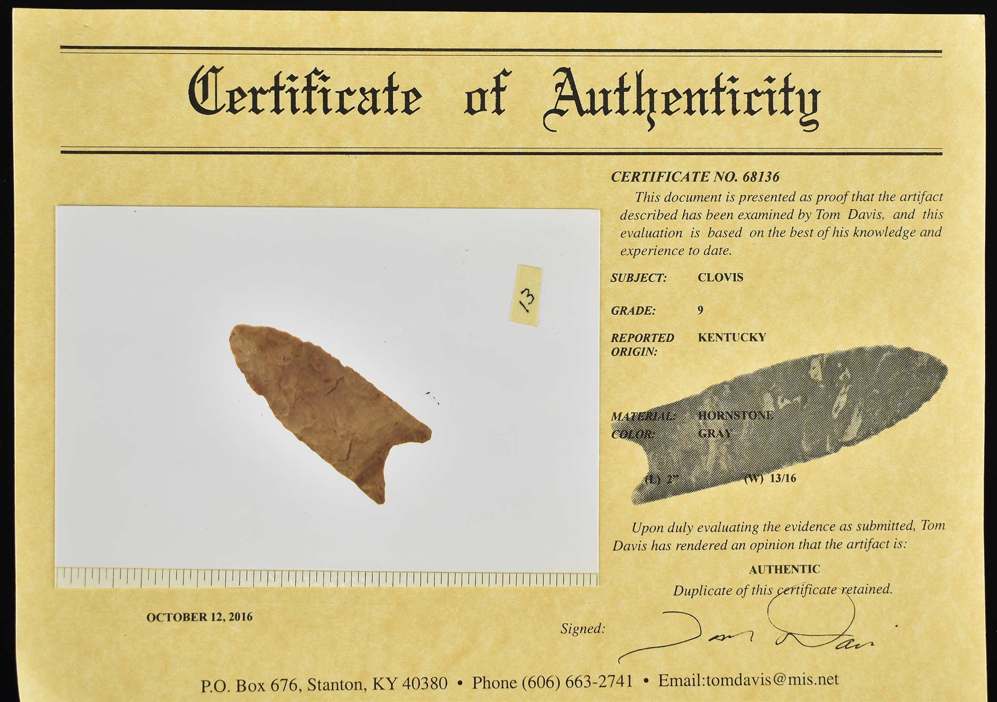 Hornstone cutie from Kentucky. Classic example of a small Clovis from the Ricardo Wyatt Collection. Davis G-9 COA from 2016.