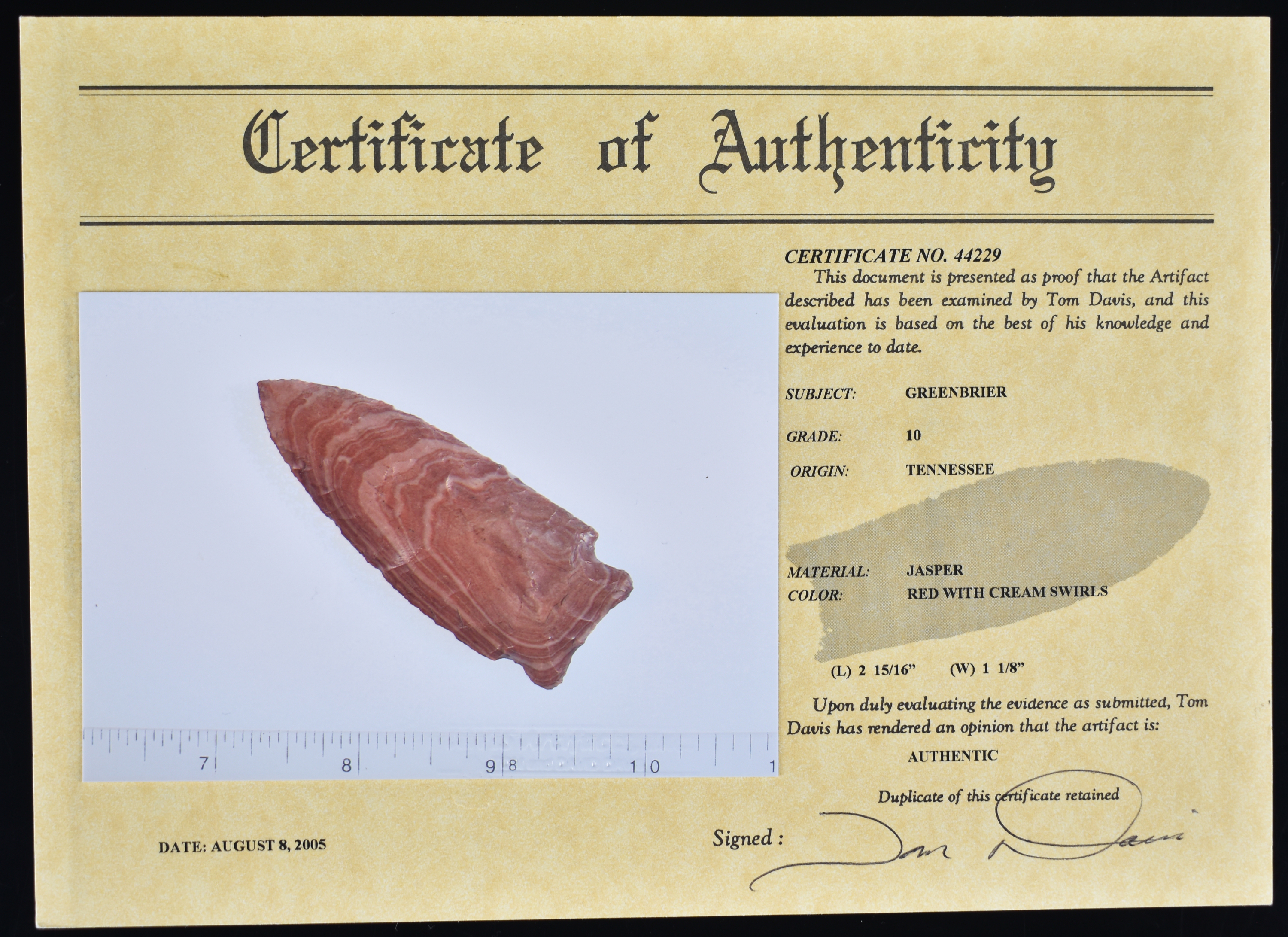 GORGEOUS Red and Cream swirled Tennessee Jasper example formerly of the Langford Keith estate collection. Davis (2005) G-10 COA. Tennessee.