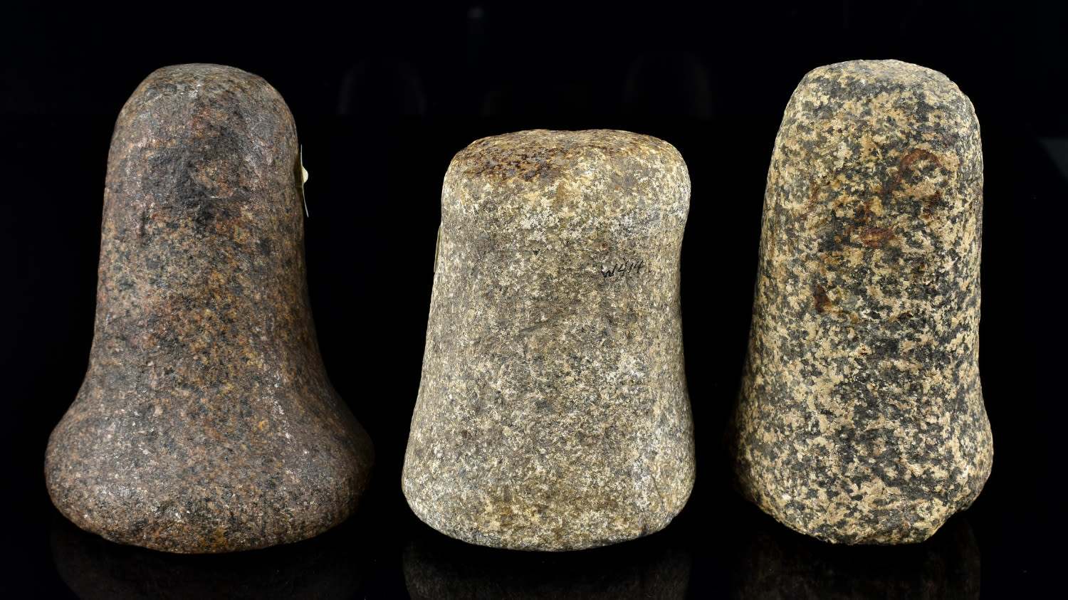 Nice lot of three Bell Pestles from the Martin McKibben Collection. Granite and Gneiss represented. Nice! Largest 5-1/8" tall.
