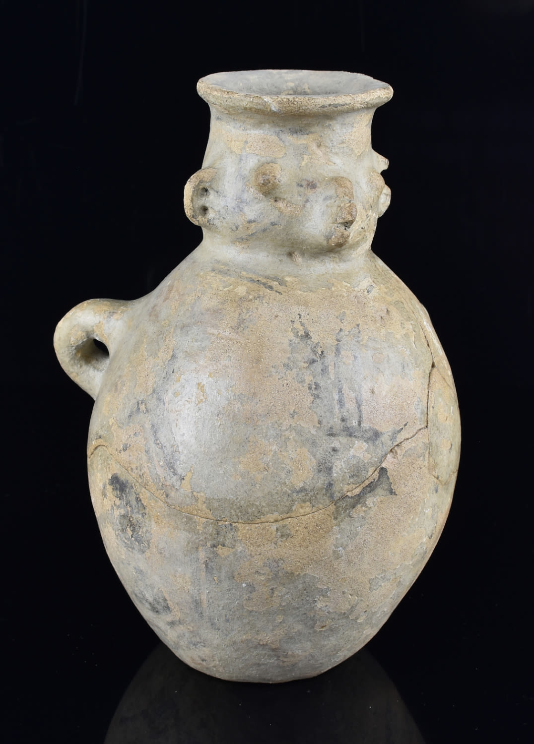 Concave based example with painted details and effigy features. Repaired damage but no apparent fill restoration. Central/South American style. Ex Martin McKibben Collection.