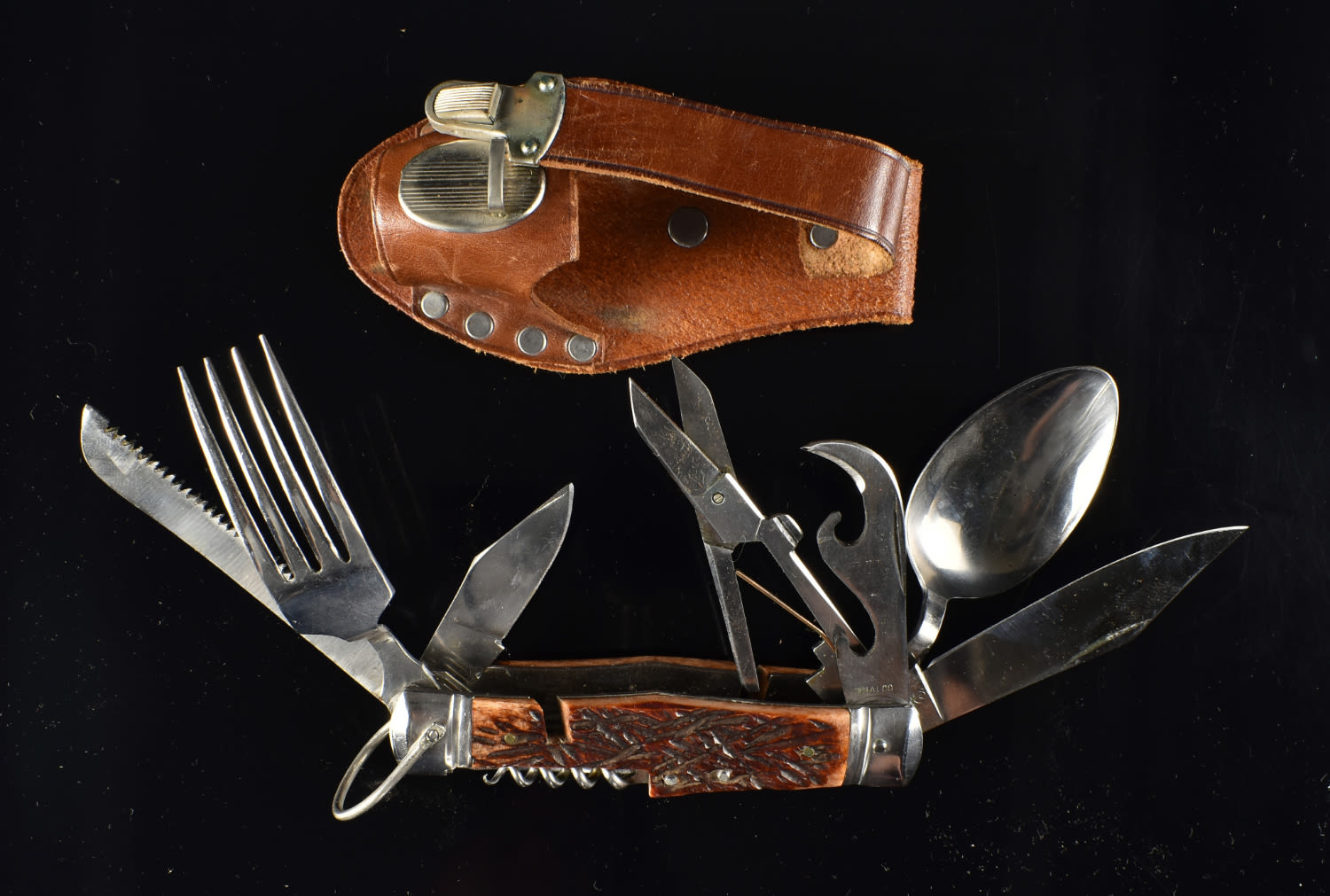 Includes original leather holster. Fork, Spoon, knife and other functions on this rare scout/camping knife.