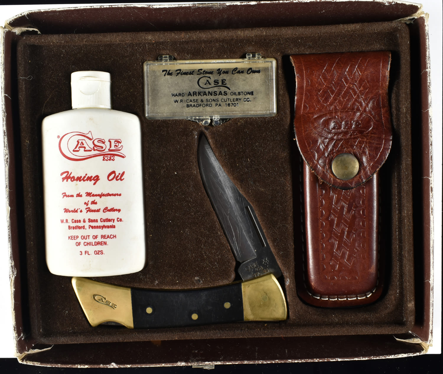 Nice Lockback knife #59L SS with leather holster, oilstone, and honing oil in original presentation packaging.