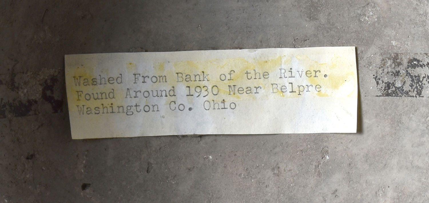 Marked as having washed out of a riverbank around 1930 near Belpre, Washington Co., Ohio. Solid with no restoration. Ex Martin McKibben Collection.