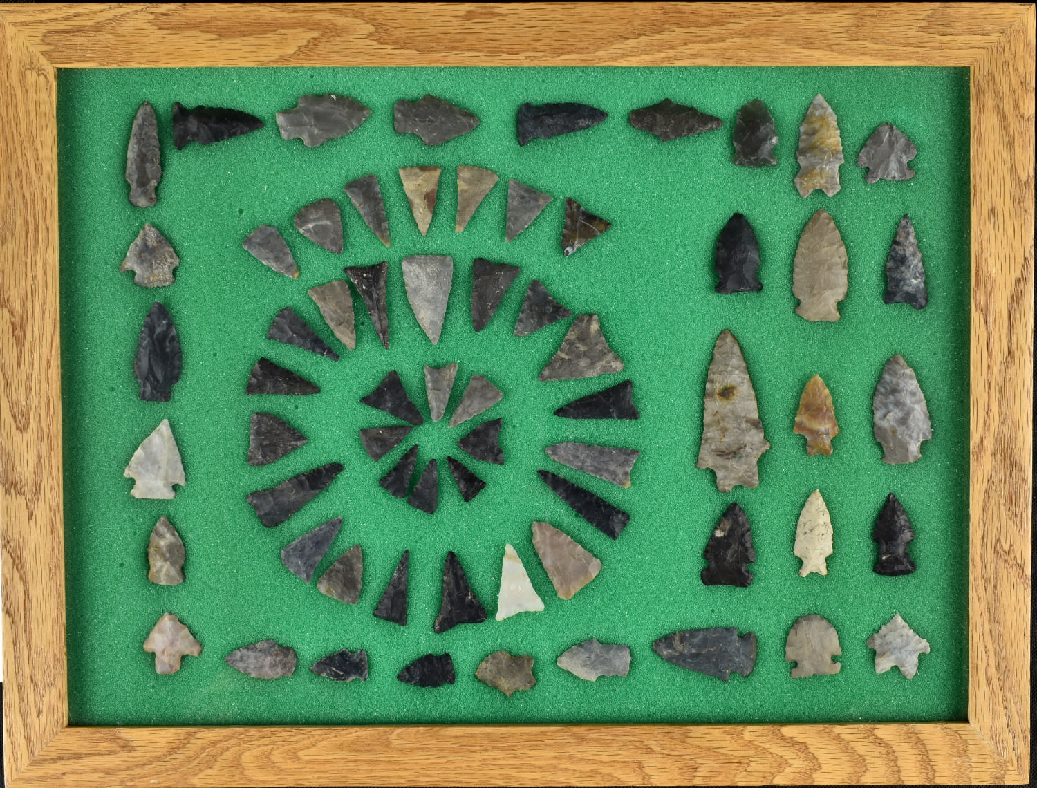 Super nice grouping with 65! Triangles, dart points and other nice examples from Stark Co., Ohio. Ex Martin McKibben Collection